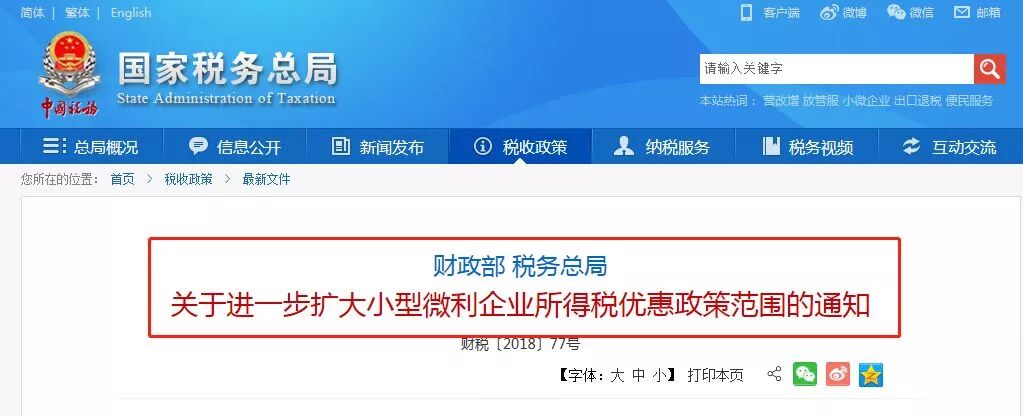 喜大普奔!企業(yè)虧損年限延長至10年,財政部緊急通知!再減稅,稅負(fù)降至10%!政策一:企業(yè)虧損年限延長至10年 關(guān)于延長高新技術(shù)企業(yè)和科技型中小企業(yè)虧損結(jié)轉(zhuǎn)年限的通知 財稅〔2018〕76號 各省、自治區(qū)、直轄市、計劃單列市財政廳(局),國家稅務(wù)總局各省、自治區(qū)、直轄市、計劃單列市稅務(wù)局,新疆生產(chǎn)建設(shè)兵團(tuán)財政局: 為支持高新技術(shù)企業(yè)和科技型中小企業(yè)發(fā)展,現(xiàn)就高新技術(shù)企業(yè)和科技型中小企業(yè)虧損結(jié)轉(zhuǎn)年限政策通知如下: 一、自2018年1月1日起,當(dāng)年具備高新技術(shù)企業(yè)或科技型中小企業(yè)資格(以下統(tǒng)稱資格)的企業(yè),其具備資格年度之前5個年度發(fā)生的尚未彌補(bǔ)完的虧損,準(zhǔn)予結(jié)轉(zhuǎn)以后年度彌補(bǔ),最長結(jié)轉(zhuǎn)年限由5年延長至10年。 二、本通知所稱高新技術(shù)企業(yè),是指按照《科技部 財政部 國家稅務(wù)總局關(guān)于修訂印發(fā)〈高新技術(shù)企業(yè)認(rèn)定管理辦法〉的通知》(國科發(fā)火〔2016〕32號)規(guī)定認(rèn)定的高新技術(shù)企業(yè);所稱科技型中小企業(yè),是指按照《科技部財政部 國家稅務(wù)總局關(guān)于印發(fā)〈科技型中小企業(yè)評價辦法〉的通知》(國科發(fā)政〔2017〕115號)規(guī)定取得科技型中小企業(yè)登記編號的企業(yè)。 三、本通知自2018年1月1日開始執(zhí)行。 財政部 稅務(wù)總局 2018年7月11日 政策二:小微企業(yè)年所得稅優(yōu)惠上限提高到100萬 關(guān)于進(jìn)一步擴(kuò)大小型微利企業(yè)所得稅優(yōu)惠政策范圍的通知 各省、自治區(qū)、直轄市、計劃單列市財政廳(局),國家稅務(wù)總局各省、自治區(qū)、直轄市、計劃單列市稅務(wù)局,新疆生產(chǎn)建設(shè)兵團(tuán)財政局: 為進(jìn)一步支持小型微利企業(yè)發(fā)展,現(xiàn)就小型微利企業(yè)所得稅政策通知如下: 一、自2018年1月1日至2020年12月31日,將小型微利企業(yè)的年應(yīng)納稅所得額上限由50萬元提高至100萬元,對年應(yīng)納稅所得額低于100萬元(含100萬元)的小型微利企業(yè),其所得減按50%計入應(yīng)納稅所得額,按20%的稅率繳納企業(yè)所得稅。 前款所稱小型微利企業(yè),是指從事國家非限制和禁止行業(yè),并符合下列條件的企業(yè): (一)工業(yè)企業(yè),年度應(yīng)納稅所得額不超過100萬元,從業(yè)人數(shù)不超過100人,資產(chǎn)總額不超過3000萬元; (二)其他企業(yè),年度應(yīng)納稅所得額不超過100萬元,從業(yè)人數(shù)不超過80人,資產(chǎn)總額不超過1000萬元。 二、本通知第一條所稱從業(yè)人數(shù),包括與企業(yè)建立勞動關(guān)系的職工人數(shù)和企業(yè)接受的勞務(wù)派遣用工人數(shù)。 所稱從業(yè)人數(shù)和資產(chǎn)總額指標(biāo),應(yīng)按企業(yè)全年的季度平均值確定。具體計算公式如下: 季度平均值=(季初值+季末值)÷2 全年季度平均值=全年各季度平均值之和÷4 年度中間開業(yè)或者終止經(jīng)營活動的,以其實際經(jīng)營期作為一個納稅年度確定上述相關(guān)指標(biāo)。 三、《財政部 稅務(wù)總局關(guān)于擴(kuò)大小型微利企業(yè)所得稅優(yōu)惠政策范圍的通知》(財稅〔2017〕43號)自2018年1月1日起廢止。 四、各級財政、稅務(wù)部門要嚴(yán)格按照本通知的規(guī)定,積極做好小型微利企業(yè)所得稅優(yōu)惠政策的宣傳輔導(dǎo)工作,確保優(yōu)惠政策落實到位。 財政部 稅務(wù)總局 2018年7月11日 解讀:符合條件的小型微利企業(yè)可以享受:所得減按50%計入應(yīng)納稅所得額,再按20%的稅率繳納企業(yè)所得稅。也就是: 符合條件的小型微利企業(yè),企業(yè)所得稅實際稅負(fù)僅僅為10%。 答疑解讀 問題1:符合條件的小型微利企業(yè),在預(yù)繳所得稅時能否就可以享受該項優(yōu)惠? 答:在預(yù)繳和年度匯算清繳企業(yè)所得稅時,通過填寫主表的附報信息和減免所得稅優(yōu)惠明細(xì)表,即可享受減半征稅政策。 問題2:享受該項優(yōu)惠的小微企業(yè),是否需要去稅局備案? 答:無需進(jìn)行專項備案。 問題3:符合條件的小型微利企業(yè),具體是什么條件? 答: 1、首先有行業(yè)要求:從事國家非限制和禁止行業(yè) 2、然后有規(guī)模要求: 工業(yè)企業(yè),年度應(yīng)納稅所得額不超過100萬元,從業(yè)人數(shù)不超過100人,資產(chǎn)總額不超過3000萬元;其他企業(yè),年度應(yīng)納稅所得額不超過100萬元,從業(yè)人數(shù)不超過80人,資產(chǎn)總額不超過1000萬元。 問題4:我公司企業(yè)所得稅實行核定征收,能否享受該項所得稅優(yōu)惠政策? 答:只有核定定率征收的企業(yè)才允許。上一納稅年度為符合條件的小型微利企業(yè),預(yù)繳時累計應(yīng)納稅所得額不超過100萬元的,可以享受減半征稅政策。 新政策1年能降稅46萬元! 新政實施前: 我公司一直從事石材加工銷售,由于每年銷售額在400萬元左右,因此目前屬于增值稅一般納稅人,按照17%計算銷項增值稅,但是由于石料的來源均是從當(dāng)?shù)貍人收購而來,僅僅只能取得個人代開的增值稅普通發(fā)票,每年光增值稅一項大約就繳納68萬元,稅收負(fù)擔(dān)非常重! 新政實施后: 我公司會計看到了剛剛發(fā)布的財稅〔2018〕33號,