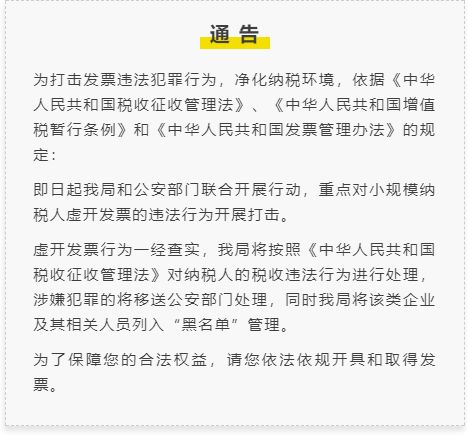 臨近年底,稅局聯(lián)合公安部門,重點(diǎn)開查小規(guī)模納稅人虛開發(fā)票行為!臨近年底,財(cái)務(wù)人員和老板們都很忙,其實(shí)稅務(wù)局一樣很忙! 那稅務(wù)局大人們忙什么呢?請看下方通告! 有老板就不明白了,為什么我做小本生意的,還要嚴(yán)查我? 可別以為咱們是小規(guī)模,稅務(wù)局就不重視咱了,畢竟咱們占的比重大,年底了,大家都有指標(biāo)要完成的呀! 先來看看, 稅局查你小規(guī)模納稅人是有理有據(jù)的! 1.先從小規(guī)模享有的稅收優(yōu)惠政策說起 小規(guī)模納稅人企業(yè),如果季度銷售額低于9萬元的話,可以免征增值稅。 可以說這是小規(guī)模納稅人的最大福利,但也是“有心人”最愛鉆的漏洞! 很多小企業(yè)就利用多余的免稅額給“需要發(fā)票”的企業(yè)虛開增值稅普通發(fā)票。這種瞄準(zhǔn)臨界點(diǎn)的,很多都涉嫌惡意串通開票,或虛開發(fā)票。 2.小微企業(yè)所得稅政策優(yōu)惠 今年國務(wù)院給小微企業(yè)放水了,應(yīng)納稅所得額不超過100萬的企業(yè)按10%征收所得稅,要知道一般企業(yè)是25%。 這里是有巨大稅率差的。也給不法分子留下了違法犯罪的空間! 3.營改增后,部分企業(yè)取得進(jìn)項(xiàng)發(fā)票困難,小規(guī)模企業(yè)成為“中轉(zhuǎn)站” 營改增之后,建安企業(yè)、勞務(wù)企業(yè)等都是因?yàn)槿〉眠M(jìn)項(xiàng)發(fā)票有難度,很多企業(yè)都是通過小規(guī)模企業(yè)給一般納稅人的企業(yè)開具增值稅專用發(fā)票或者普通發(fā)票。 有以上情況的老板們,創(chuàng)客菌勸您可趕緊懸崖勒馬吧!你以為天衣無縫,其實(shí)難逃稅務(wù)局的火眼金睛! 金稅三期無死角,大數(shù)據(jù)分析分分鐘看透你! 自從金稅三期上線后,只要稅務(wù)局想查你,利用大數(shù)據(jù)進(jìn)行稅務(wù)分析,就能找出哪些企業(yè)有風(fēng)險(xiǎn),一個(gè)查一個(gè)準(zhǔn)! 如果銷售額持續(xù)一年都是每季度都是9萬附近的話,那就很容易被稅務(wù)大數(shù)據(jù)查到。接著就是追查發(fā)票流向是否合理、開出的發(fā)票內(nèi)容是否恰當(dāng),虛開發(fā)票幾乎是瞞不住的! 另外,別以為小規(guī)模企業(yè)千千萬,人家找你不容易,那您就小看金稅三期了,人家從海量的信息里找到高風(fēng)險(xiǎn)的你,還是比較容易的! 小規(guī)模企業(yè)不是法外之地,老板和財(cái)務(wù)們一定要重視。 一起來看看,來自志誠財(cái)務(wù)小編的提醒: 1. 一定不要抱僥幸心理,現(xiàn)在有這些中介公司會介紹營業(yè)額小的企業(yè)去虛開賺取開票費(fèi),咱們可不能為了那么點(diǎn)“回報(bào)”,因小失大! 2. 必須嚴(yán)格把控采購與銷售的這兩個(gè)重要環(huán)節(jié)。不僅要積極取得合規(guī)的采購發(fā)票,還要按照稅務(wù)機(jī)關(guān)的要求開具合乎規(guī)定發(fā)票,不能隨意。 3. 至于企業(yè)所得稅,更要認(rèn)真核算,不能為了不繳或者少繳企業(yè)所得稅,完全用費(fèi)用沖減收入,如果再稅務(wù)抽查中被視為“假賬”,那就嚴(yán)重了! 龍巖市志誠財(cái)務(wù)管理有限公司是一家專業(yè)從事龍巖公司注冊、代理記賬、商標(biāo)注冊、專利申請、審計(jì)稅審、會計(jì)代理、工商注冊、財(cái)務(wù)咨詢、稅收籌劃的綜合性財(cái)務(wù)管理機(jī)構(gòu),專業(yè)背景扎實(shí),工作作風(fēng)嚴(yán)謹(jǐn),數(shù)年來,為上萬家企業(yè)提供了權(quán)威、系統(tǒng)、完善的財(cái)會及稅務(wù)管理解決方案,在客戶間形成了良好的口碑,在同行業(yè)內(nèi)亦獲得了高度認(rèn)同。 公司團(tuán)隊(duì) 職業(yè)團(tuán)隊(duì)由多位資深注冊會計(jì)師和注冊稅務(wù)師帶領(lǐng),集結(jié)持有高、中級職稱的財(cái)會人才組成。 核心理念 以我們最大的細(xì)心、耐心、責(zé)任心,讓您省心、放心,我們的努力只為打造卓越的中小企業(yè)財(cái)務(wù)服務(wù)平臺,提供全方位、多元化、高效率的優(yōu)質(zhì)服務(wù),為您提供最好的財(cái)稅整體解決方案。 服務(wù)承諾 以專業(yè)的財(cái)務(wù)知識,優(yōu)質(zhì)服務(wù)做好企業(yè)的財(cái)務(wù)顧問、稅務(wù)顧問,做好企業(yè)的財(cái)務(wù)助手。認(rèn)真履行財(cái)會職責(zé),及時(shí)準(zhǔn)確地進(jìn)行賬務(wù)處理,編制財(cái)務(wù)報(bào)表,按時(shí)進(jìn)行納稅申報(bào),做好企業(yè)的財(cái)務(wù)顧問角色。隨時(shí)接受客戶的工作檢查,認(rèn)真與客戶做好財(cái)務(wù)工作的溝通。配合稅務(wù)稽查,協(xié)調(diào)好企業(yè)與稅務(wù)的關(guān)系。對客戶經(jīng)營過程中遇到的稅務(wù)問題進(jìn)行合理的籌劃,規(guī)避企業(yè)的稅務(wù)風(fēng)險(xiǎn)。對客戶在融資渠道上提供建議及指引,適時(shí)為客戶進(jìn)行融資協(xié)助。 龍巖市志誠財(cái)務(wù)管理有限公司”是龍巖市工商行政管理局登記的公司注冊代理機(jī)構(gòu),擁有專業(yè)的團(tuán)隊(duì)致力為龍巖市區(qū)廣大客戶,提供龍巖注冊公司,龍巖代辦執(zhí)照,龍巖公司代辦,http://m.cgmproperties.com 龍巖分公司注冊登記、公司股權(quán)轉(zhuǎn)讓、公司經(jīng)營范圍、法定代表人、經(jīng)營場所等事項(xiàng)變更登記、食品流通許可證、道路運(yùn)輸許可證、餐飲服務(wù)許可證等特殊許可證代辦、會計(jì)