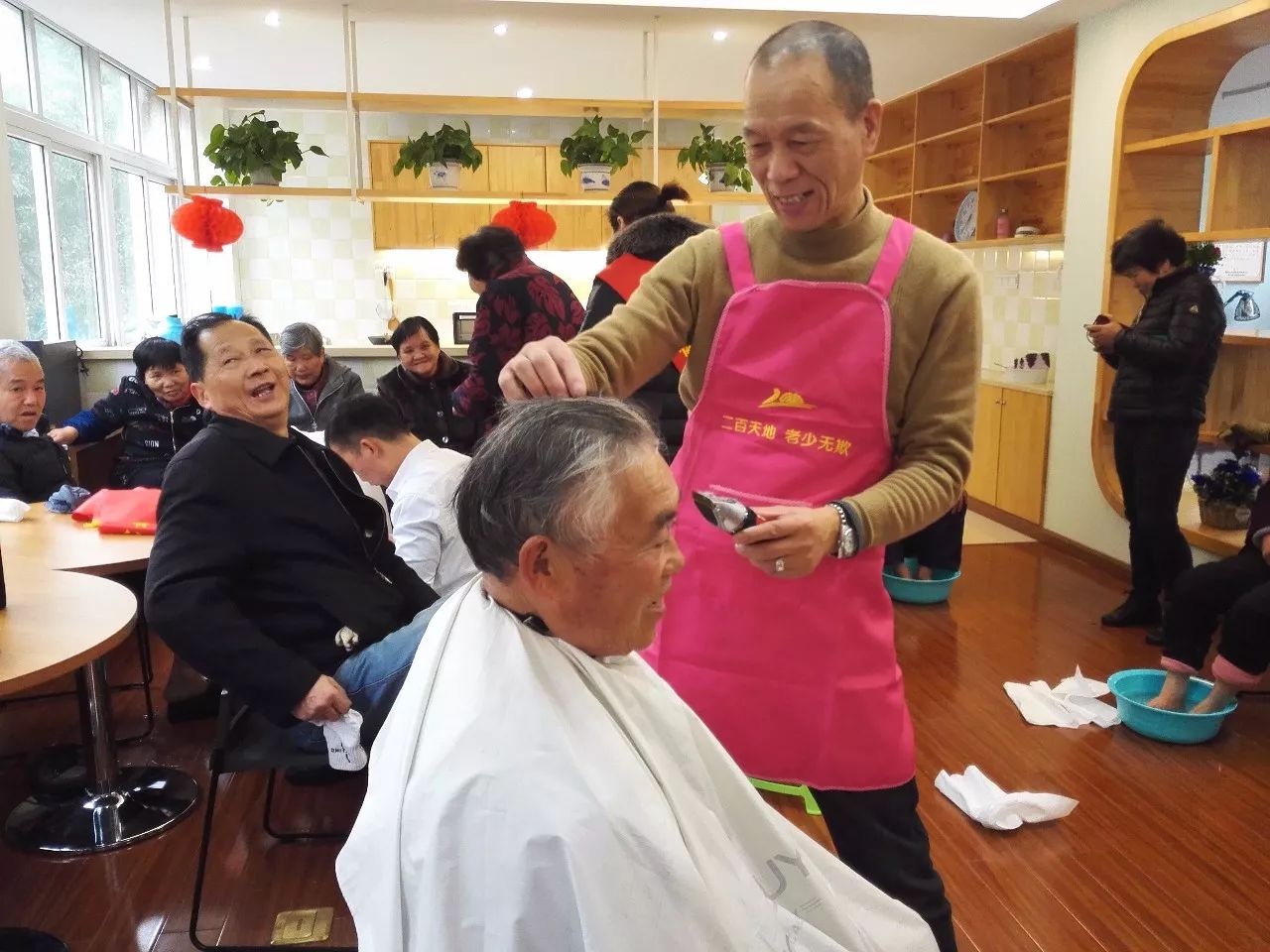 活動(dòng)開始沒幾分鐘,義務(wù)理發(fā)區(qū)就排起了長長的隊(duì)伍,二百的專業(yè)理發(fā)人員“朱師傅”一邊仔細(xì)地為每一位老年者理發(fā),一邊同他們聊家常,爽朗的笑聲充斥著整個(gè)大廳。